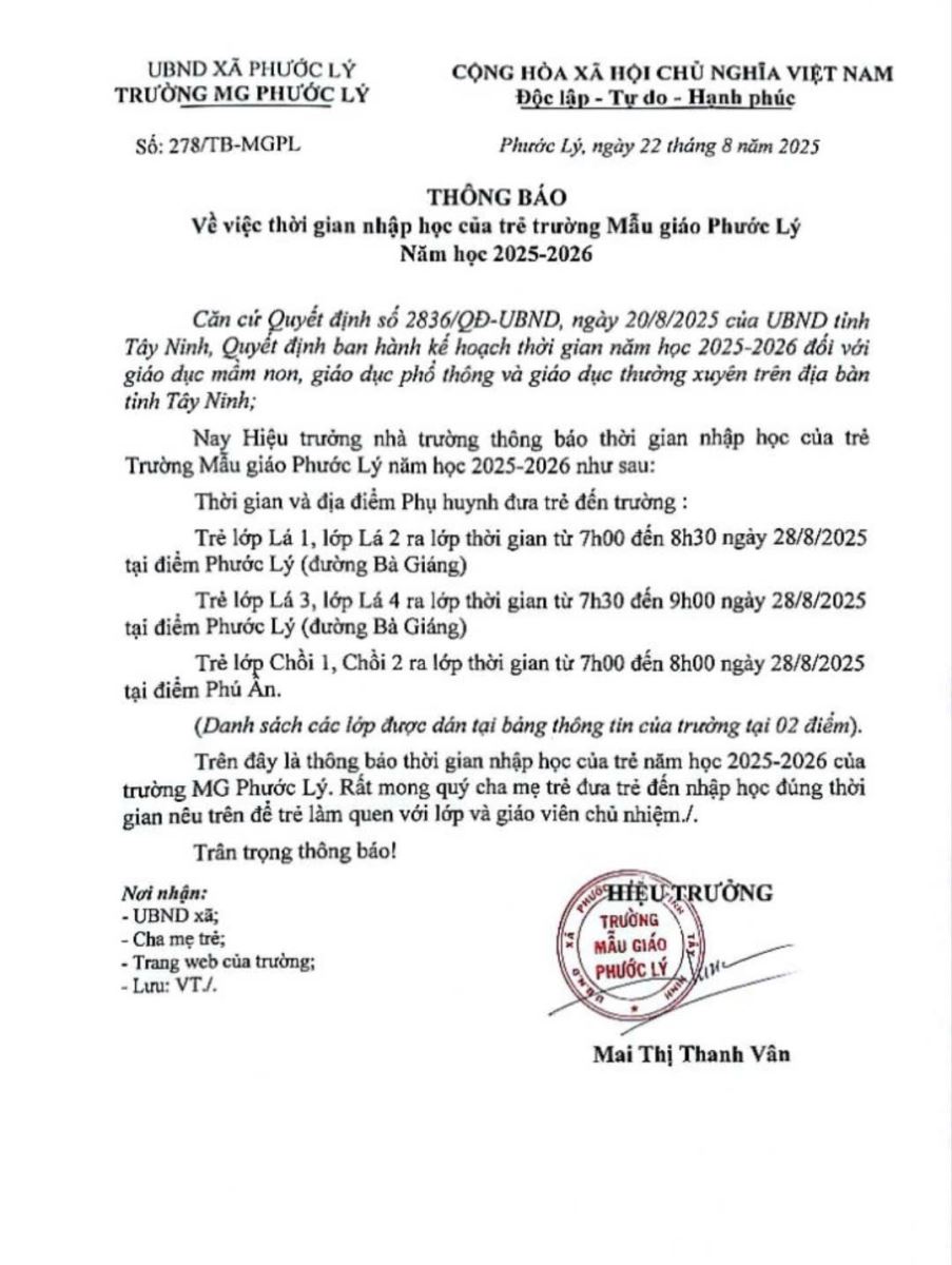 • Trường Mẫu giáo Phước Lý thông báo thời gian nhập học năm học 2025-2026